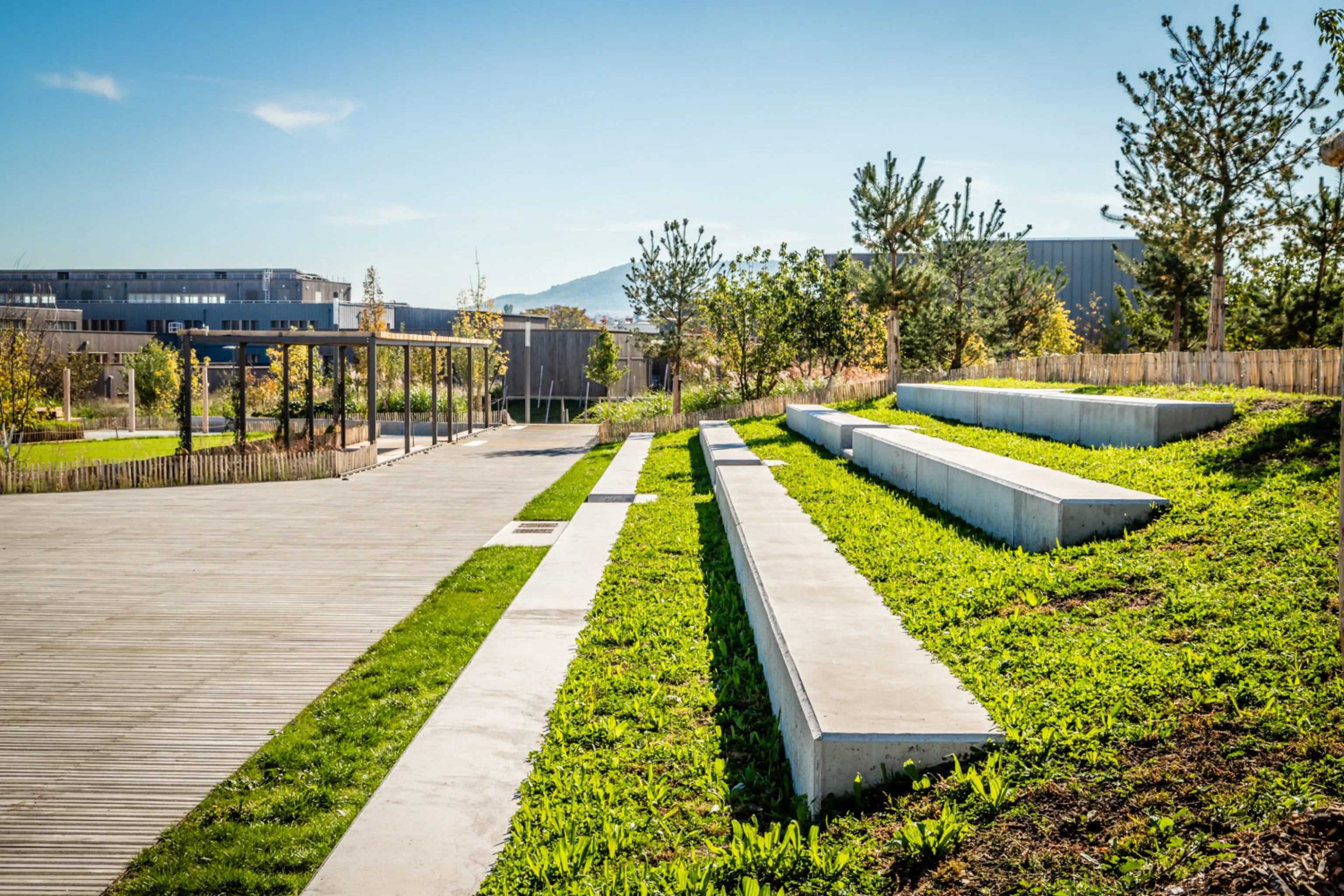Conçu comme un « parc habité », le quartier préserve 40 arbres et accueille, en complément, 340 sujets. La dépollution soigneuse des sols augmente la proportion de terres fertiles de 16 % à 71 %.